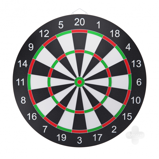 Комплект мишени включает в себя 6 дротиков с металлическими наконечниками и имеет 2 разные мишени с двух сторон. Кроме того, в комплекте идут флайты с американским и английским флагами, что делает эту мишень еще более интересной. Диаметр мишени составляет 43 см.